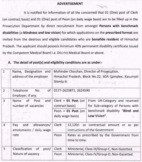 HP Prosecution Department Clerk & Peon Recruitment 2023 Advertisement and Requisition for filling up of 01 (One) post of Clerk (on contract basis) and 01 (One) post of Peon (on daily wage basis) from amongst the Persons with disabilities (Blind and Low Vision) in the Prosecution Department.